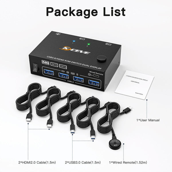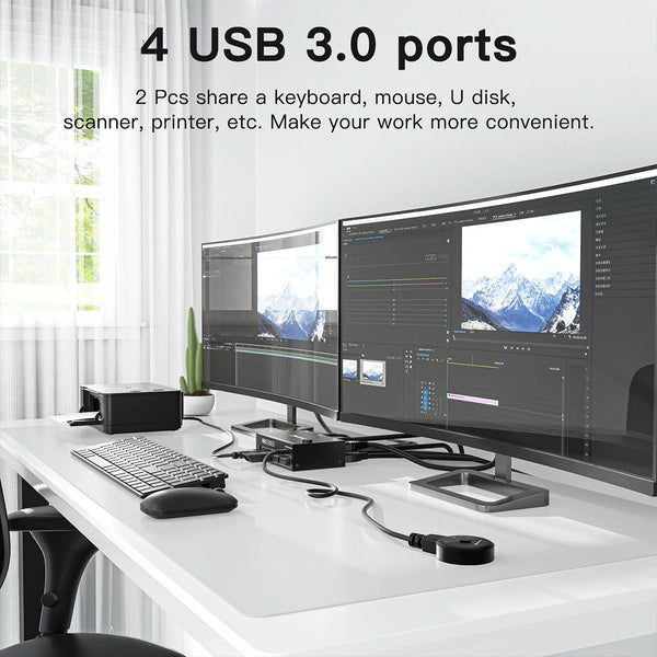 1. HDMI KVM switch: This product allows you to control 2 computers or laptops, share 4 USB 3.0 devices and 2 monitors (extended display mode or duplicate display mode) with only one set of wired or wireless keyboard and mouse.