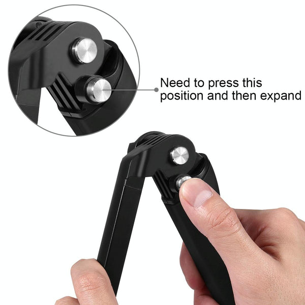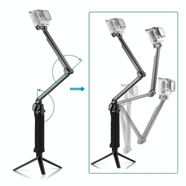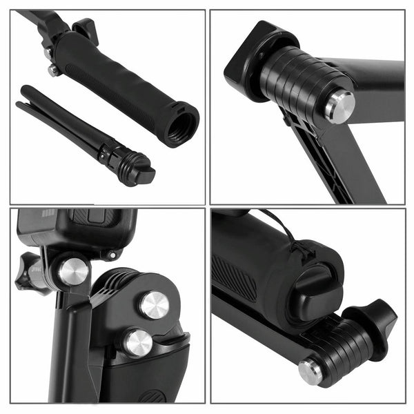 2. Three-section pole design for 3-way: Camera grip, foldable extension arm, and low angle shot stabilizer.
