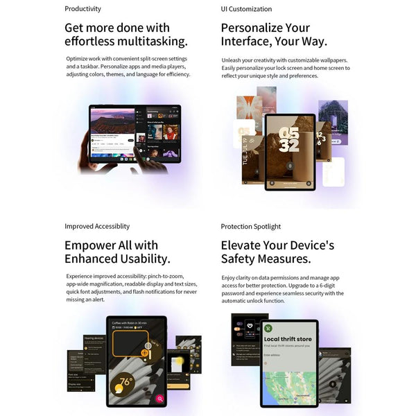 3. Advanced Android 14 Experience: Featuring Android 14, the P85T tablet provides a landscape-enhanced Parallel View, a convenient Taskbar for efficient multitasking, and robust parental control options for safe usage.