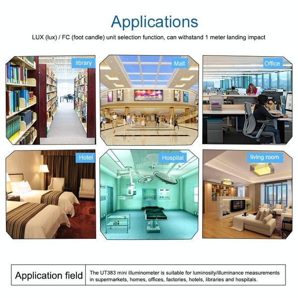 UT383 is a mini lux meter equipped with photoelectric sensing technology, which can effectively represent light intensity and electrical signals, then process the data and display the results on the LCD.