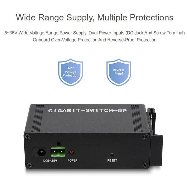 Waveshare Industrial 5P Gigabit Ethernet Switch, Full-Duplex 10/100/1000M, DIN Rail Mount