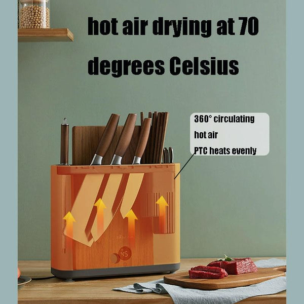 4. Please insert the knives and kitchen utensils correspondingly to prevent damage to the UV lamp and heating components. It is strictly forbidden to put this product in high-temperature appliances such as microwave ovens, disinfection cabinets or dishwashers.