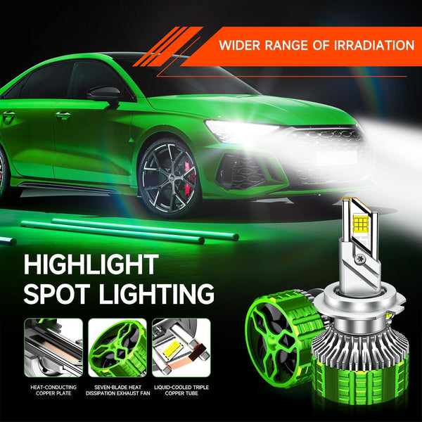 11. Double-layer copper substrate + built-in double copper tube heat conduction system, with hydraulic fan, the speed can reach 15000rmp, which can dissipate heat more efficiently and quickly, making the car lights run more stably, and greatly increasing the service life of LED car lights, the service life can reach more than 50000h 12. Use 12 3570-55mil ZES chip, with a power of up to 120W, provides you with up to 12000LM ultra-bright lighting, turning night into daytime and ensuring your driving safety