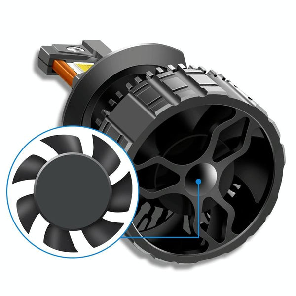 11. Double-effect integrated heat dissipation: double-layer copper substrate + built-in double copper tube heat conduction system, with hydraulic fan, the speed can reach 15000rmp, which can dissipate heat more efficiently and quickly, making the lamp run more stable, and greatly increase the service life of LED lamps, the service life can reach more than 50000h 12000LM ultra-high brightness: A1 headlights use 12 3570-55mil ZES chips, with a power of 120W