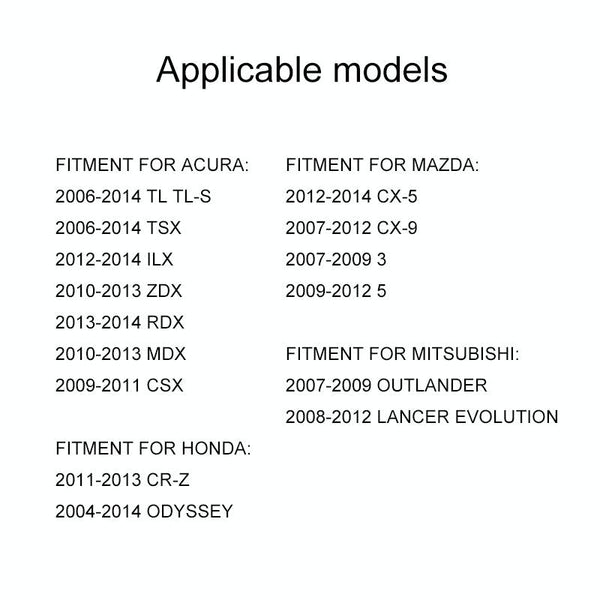 10. Applicable models: suitable for Honda Accord 8th generation, Odyssey 2004-2014, Civic, CRV, CR-Z 2011-2013, Acura TL TL-S 2006-2014, TSX 2006-2014, ILX 2012-2014, ZDX 2010- 2013, RDX 2013-2014, MDX 2010-2013, CSX 2009-2011, applicable to Mazda CX-5 2012-2014, CX-9 2007-2012, 3 2007-2009, 5 2009-2012, applicable to Mitsubishi Outlander 2007- 2009, Lancer Evolution 2008-2012