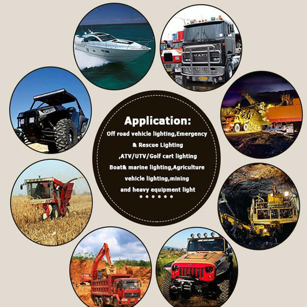 6. Application: Off road vehicle lighting, emergency & rescue lighting, ATV / UTV / Golf cart lighting, boat & marine lighting, agriculture vehicle lighting, mining and heavy equipment light.