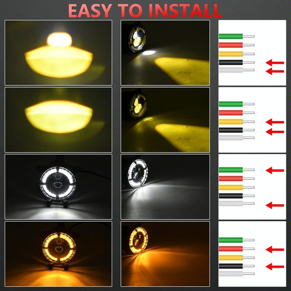 1. Four modes: The product has 4 modes: high beam (white light), low beam (yellow light), daytime running light (white light), and turn signal (yellow light). You can switch the lighting mode you need according to the driving environment.