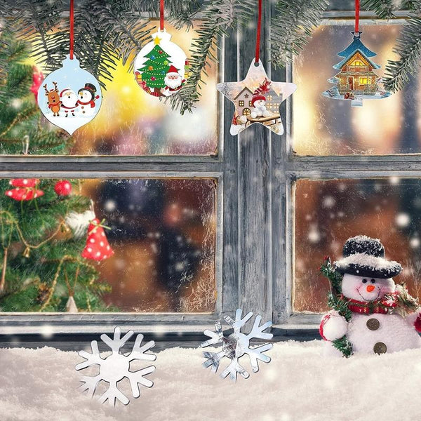 6. Size: bell/tree/round/house about 7 x 8cm, gift box about 6.9 x 8.9cm, snowman about 6.3 x 8.9cm, hat about 6.9 x 8.4cm, triangular round about 7.5 x 9.3cm, snowflake about 8.2 x 8.2cm, thick about 0.2cm, red rope length about 30cm x 10 pcs