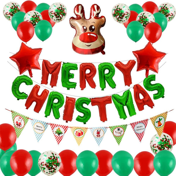 5. 16-inch Christmas letter x1 set, deer head balloon x1, 18-inch red five-pointed star x2, 12-inch green balloon x12, 12-inch red balloon x12, Christmas flag x1 set, 12-inch red and green sequined balloon x8, ribbon x1 roll , Dispensing x1 piece