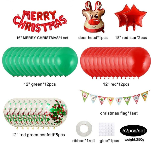 5. 16-inch Christmas letter x1 set, deer head balloon x1, 18-inch red five-pointed star x2, 12-inch green balloon x12, 12-inch red balloon x12, Christmas flag x1 set, 12-inch red and green sequined balloon x8, ribbon x1 roll , Dispensing x1 piece