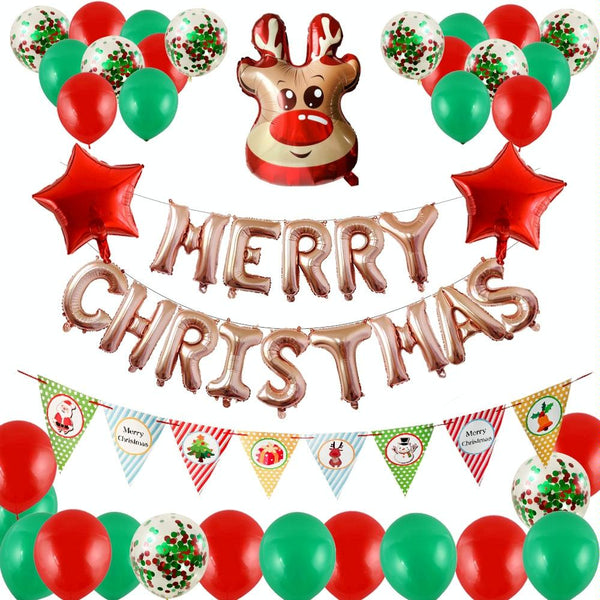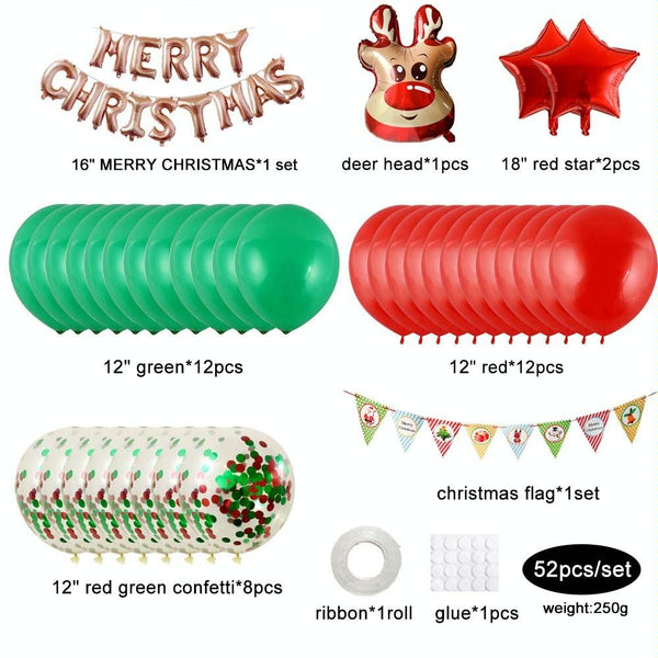 5. 16-inch Christmas letter x1 set, deer head balloon x1, 18-inch red five-pointed star x2, 12-inch green balloon x12, 12-inch red balloon x12, Christmas flag x1 set, 12-inch red and green sequined balloon x8, ribbon x1 roll , Dispensing x1 piece