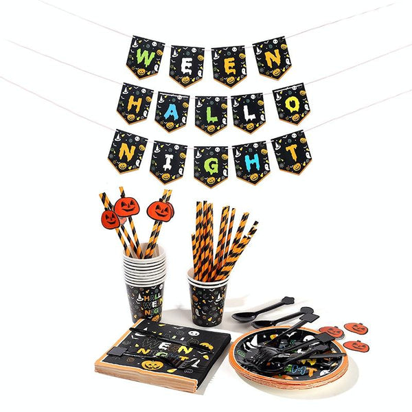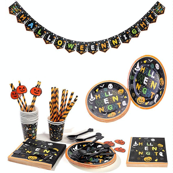 24 Person Set Halloween Party Decoration Tableware Set Tablecloth Paper Plate Banner Without Straw