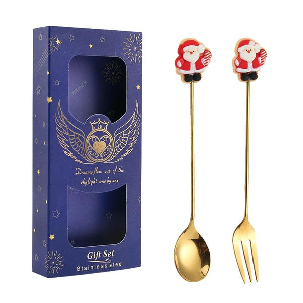 2pcs /Pack Christmas Gift Spoon Cartoon Fruit Fork Dessert Coffee Scoop, Style: Elderly (Blue Box)