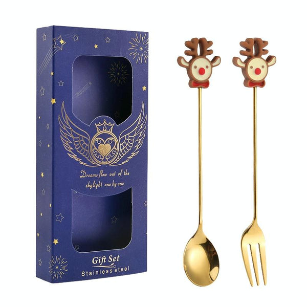 2pcs /Pack Christmas Gift Spoon Cartoon Fruit Fork Dessert Coffee Scoop, Style: Elk (Blue Box)