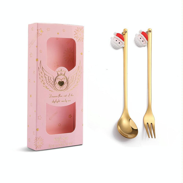 2pcs /Pack Christmas Mixing Spoon Fruit Fork With Pendant Flatware, Style: Elderly (Pink Box)
