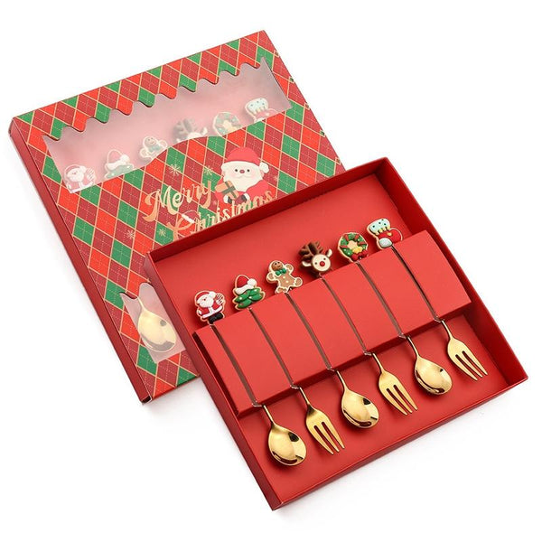 6pcs /Pack Christmas Gift Spoon Cartoon Fruit Fork Dessert Coffee Scoop, Style: Spoon Fork (Red Box)