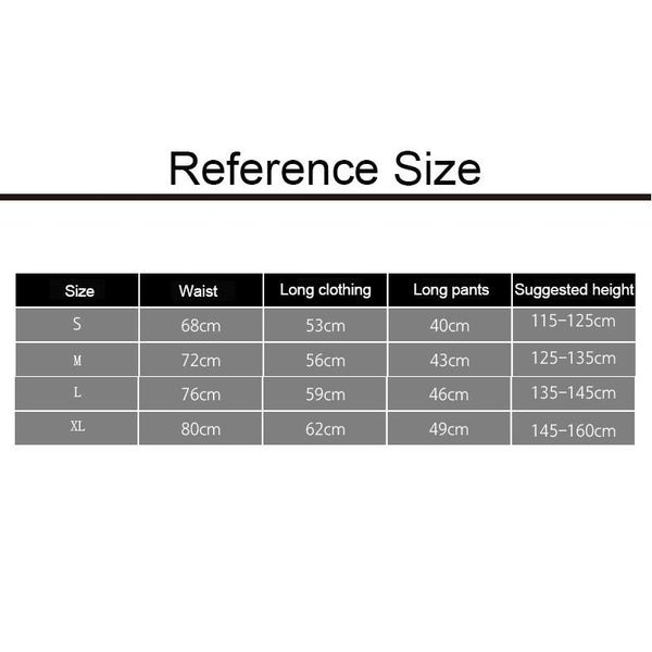 1: Size:S, Waistline: 68cm, Dress Length: 53cm, Long Pants: 40cm, Suggested Height:115-125cm
