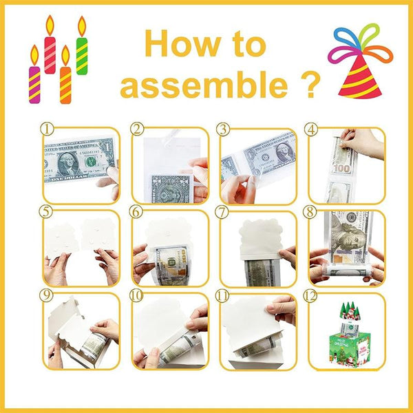 3. Simply put the money in the transparent bag, connect it together, and stick it on the "pumpkin" card. Roll up the money and put it in the gift box. Pass the card through the opening of the gift box, and the money will flow out when you pull it