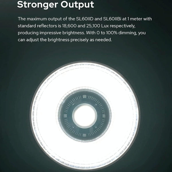 1. Stronger Output: The maximum output of the SL60IID and SL60IIBi at 1 meter with standard reflectors is 18,600 and 25,100 Lux respectively, producing impressive brightness. With 0 to full dimming, you can adjust the brightness precisely as needed.