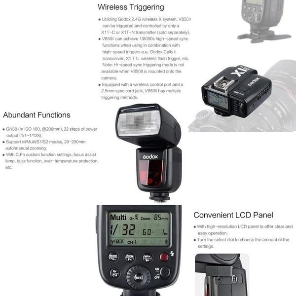 - Using Godox 2.4G wireless X system, Godox V850II can only be used by X1T-C or X1T-N X1T-S. When combined with high-speed triggers, Godox V850II can achieve 1/8000s high-speed synchronization.