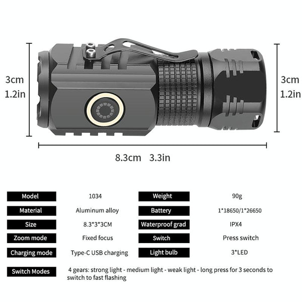3LED Strong Light TYPE-C Charging Convenient Mini Multi-Function Flashlight(With USB Cable No Battery)