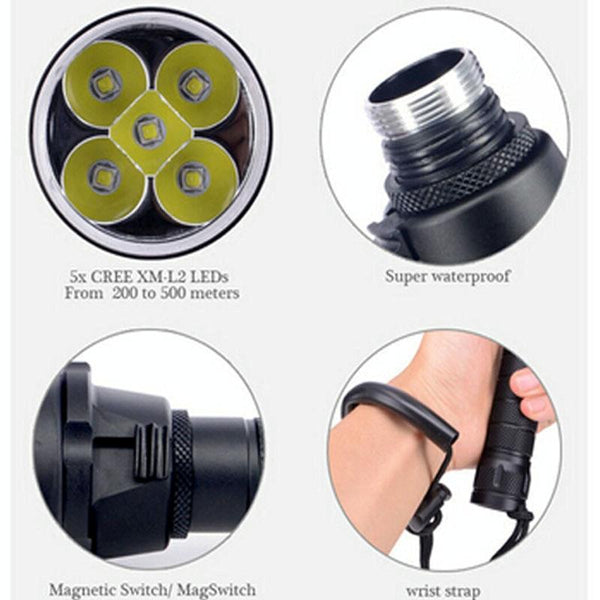 5 x CREE XM-L2 White Light Diving Flashlight, 6800 LM, Diving Depth: 150m (Black)