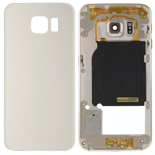 Search terms: Samsung Galaxy S6 Edge, G925, back housing, back cover, rear housing, replacement part, gold, repair, broken, damaged, bezel, middle frame, camera lens panel.