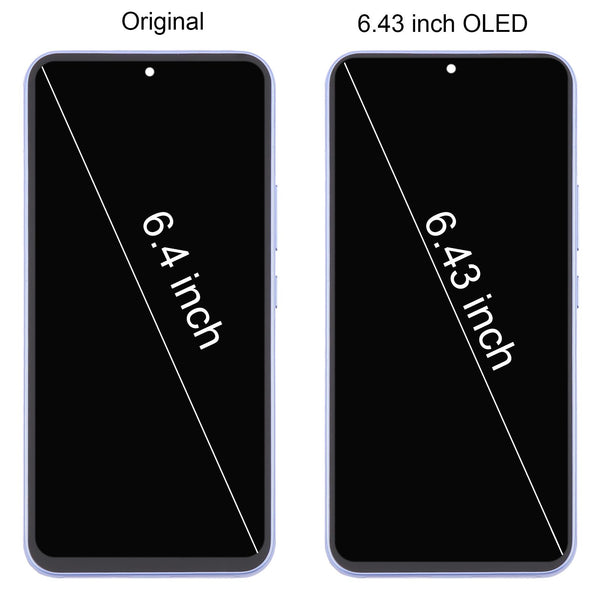 Replace your cracked or faulty Samsung Galaxy A54 5G screen with this high-quality purple LCD and digitizer assembly. This complete unit includes the LCD screen, digitizer (touch sensor), and frame, making installation easier. Restore your phone's vibrant display and responsive touch functionality with this reliable replacement part.