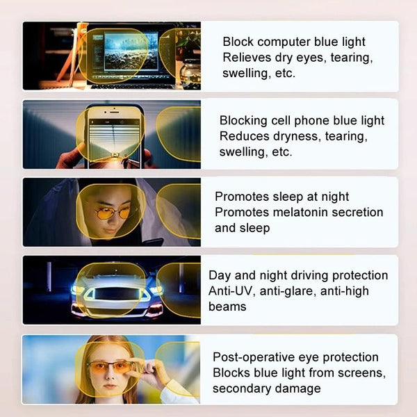 - Blocking blue light from cell phone/computer: easing dry eyes, tearing, swelling, etc.