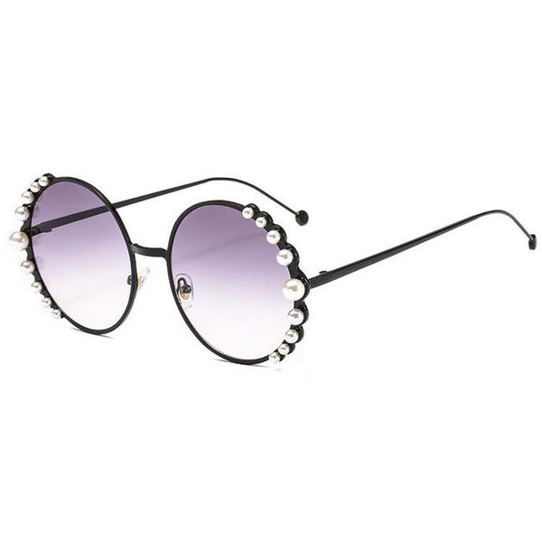 Women Sunglasses Metal Round Frame Pearl Embellished Sunglasses(Black Frame Grey Lens)