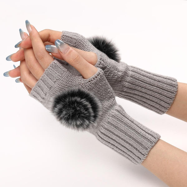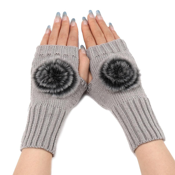 Autumn And Winter Women Fingerless Fur Ball Gloves Knitted Wool Warm Sleeves(Light Grey)