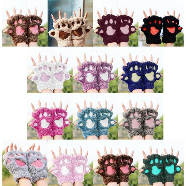 Winter Lovely Cartoon Cat Claw Lady Gloves Thick Warm Fluffy Paws Half Finger Gloves(Coffee)