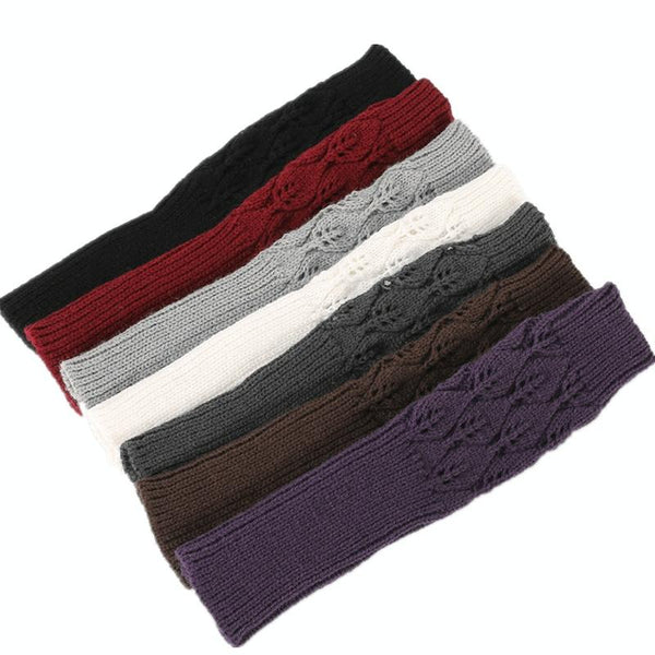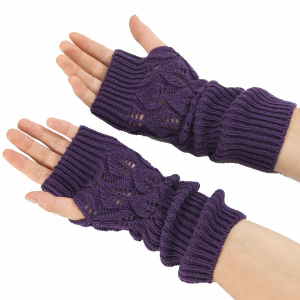 Winter Men and Women Knitted Jacquard Leaves Cycling Warm Fingerless Wool Gloves(Purple)