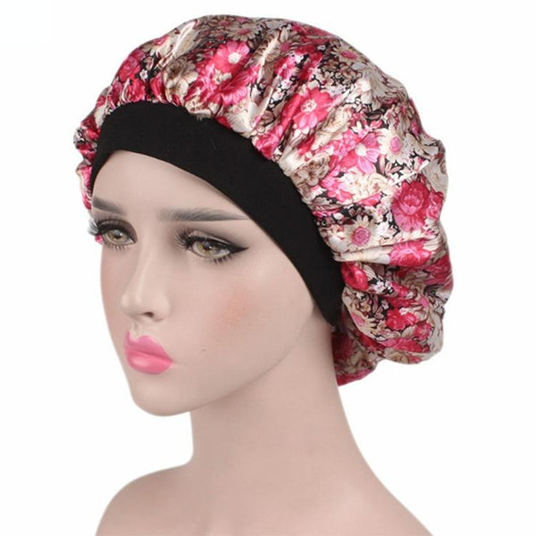 2 PCS Women Satin Night Sleep Cap Hair Bonnet Hat Silk Head Cover Wide Elastic Band(Magenta Small Flower)
