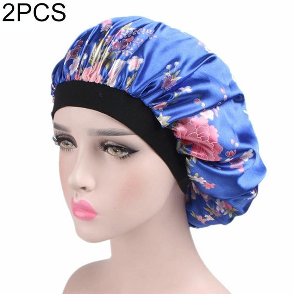2 PCS Women Satin Night Sleep Cap Hair Bonnet Hat Silk Head Cover Wide Elastic Band(Royal Blue Flower)