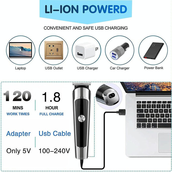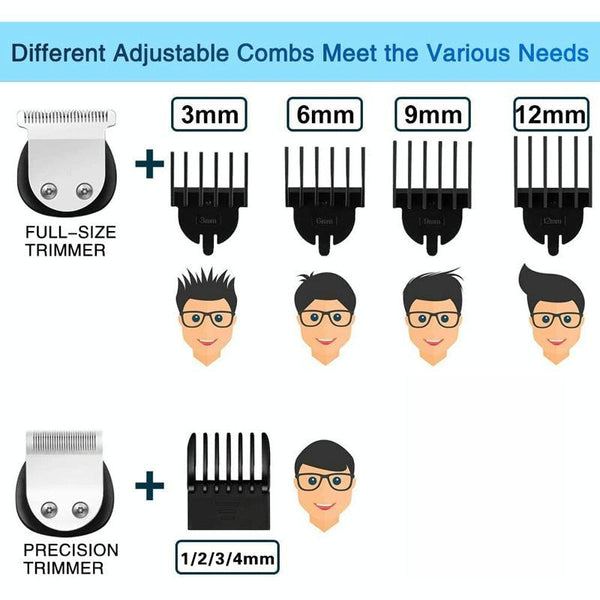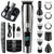 12. Accessories: storage box, T-shaped blade, U-shaped blade, nose hair trimmer, razor, lettering knife, body hair cutter, cleaning brush, oil bottle, USB cable, limit comb (3/6/9/12MM)