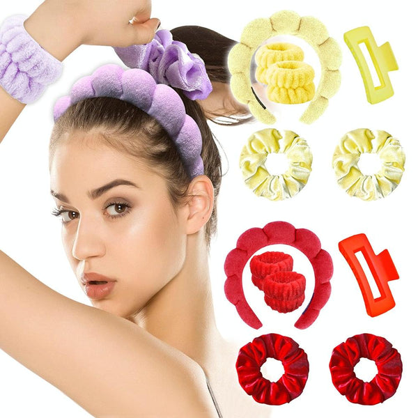 5. 6-piece set - 2 hair ties, 1 hair clip, 1 face wash hair tie, 2 face wash wristbands. This set is perfect for your makeup and face wash needs.