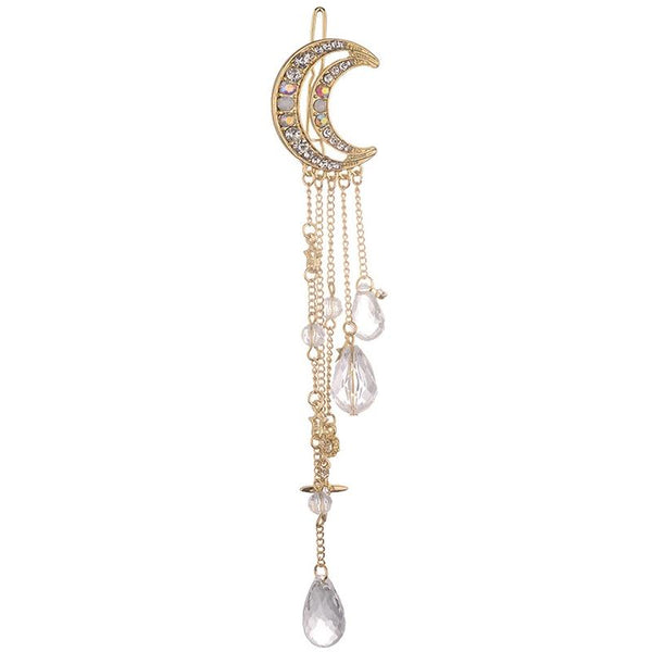Fashion Elegant Women Lady Moon Rhinestone Crystal Tassel Long Chain Beads Dangle Hairpin Hair Clip Hair Jewelry(Gold)