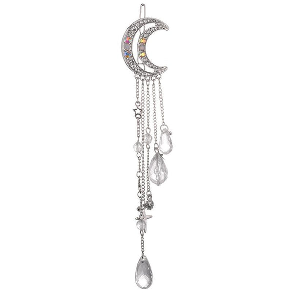Fashion Elegant Women Lady Moon Rhinestone Crystal Tassel Long Chain Beads Dangle Hairpin Hair Clip Hair Jewelry(Silver)