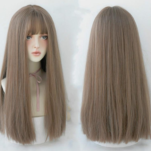 Female Black Long Straight Wig With Air Bangs(Honey Tea Linen (Solid Color) 58CM)
