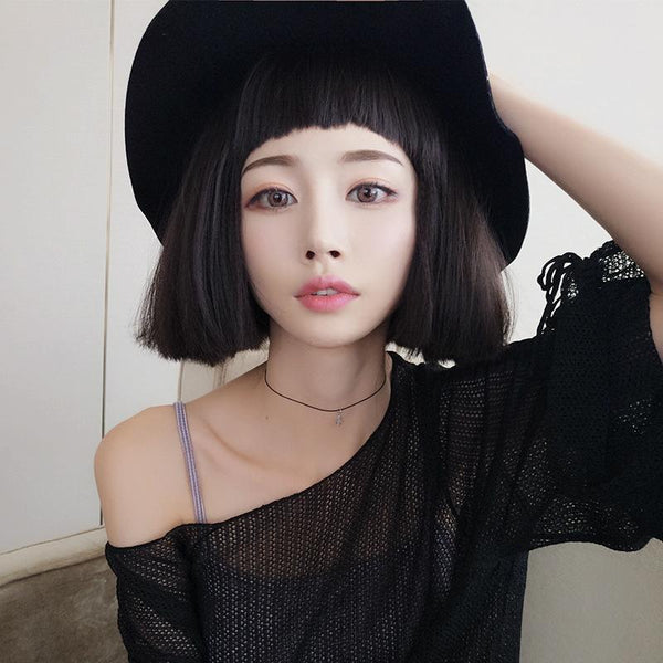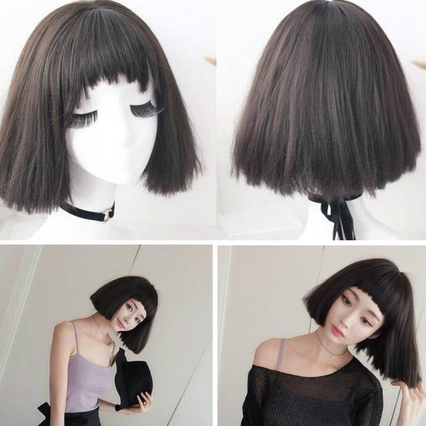 Female Short Wigs Hair Ion Perm Realistic Chemical Fiber Headgear Student Bobo Head(Black Brown 37CM)