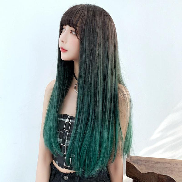Gradient Color Long Straight Hair Wig Female Chemical Fiber Headgear Simulation Hair(Malachite Green Gradient 65CM)