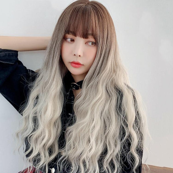 Gradient Long Curly Hair Big Wave Chemical Fiber Simulation Hair Women Bangs Full Top Hair Cover(Milk Tea Gradient 68CM)