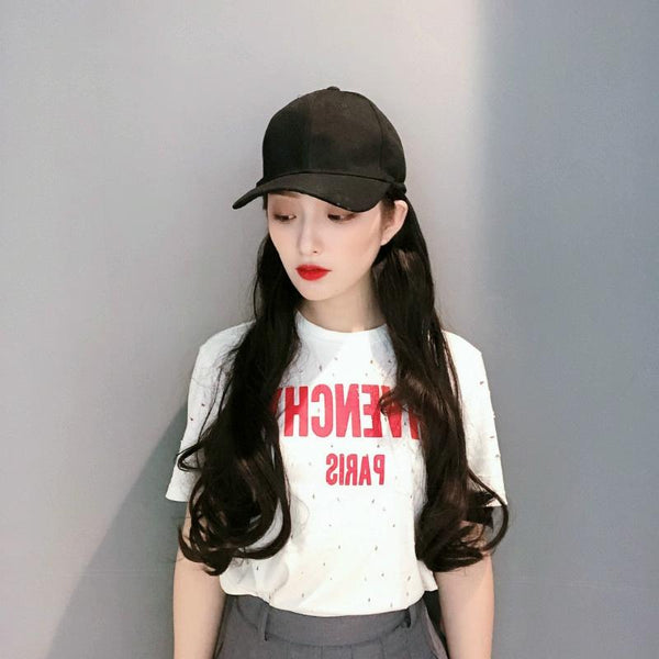 Hat Big Curve Wig One-piece Long Curly Chemical Fiber Headgear for Women(Black)