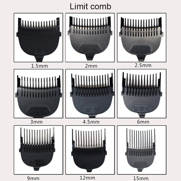 7. Products include: 1.5mm, 2mm, 2.5mm, 3mm, 4.5mm, 6mm, 9mm, 12mm, 15mm limit comb, small oil bottle, small brush, charging cable, instruction manual, hair clipper,spare blade