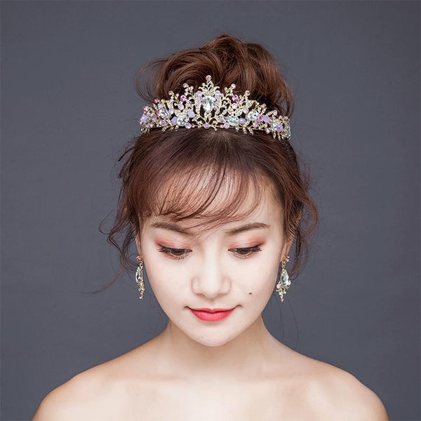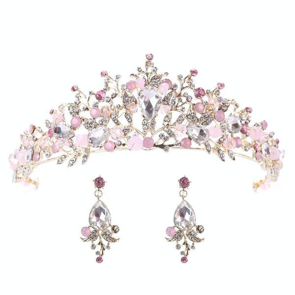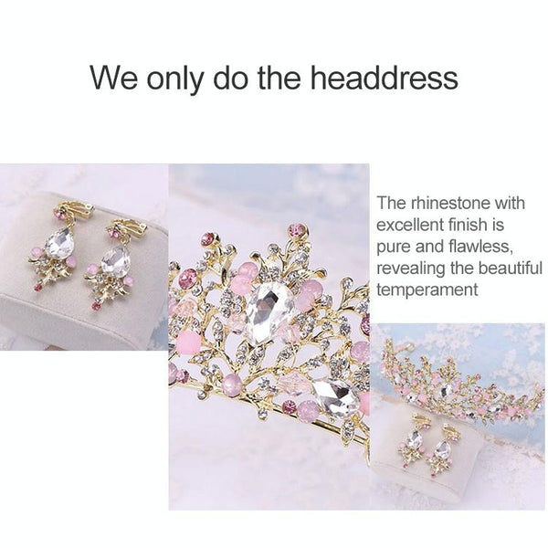 Pearl Bridal Crowns Handmade Headband Crystal Wedding Queen Crown Wedding Hair Clips(Pink With Earrings)