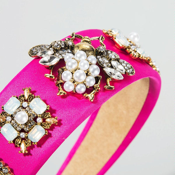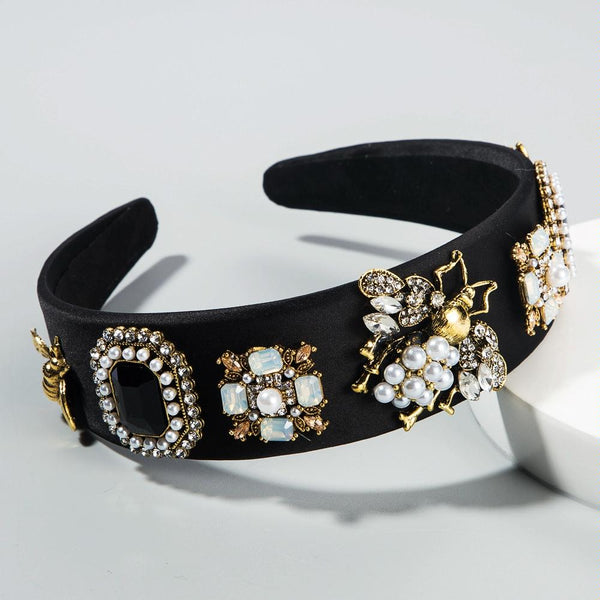 Pearl Headband With Rhinestones Bee Colorful Cloth Garland Headdress(Black)