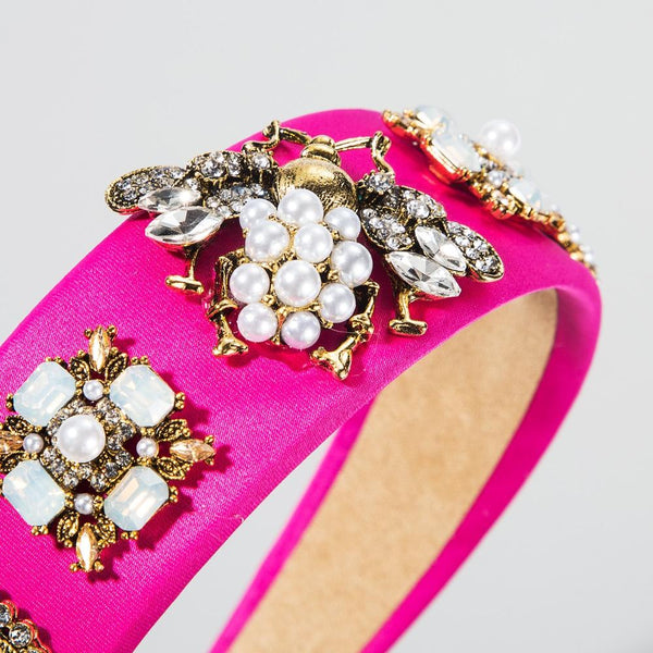 Pearl Headband With Rhinestones Bee Colorful Cloth Garland Headdress(Red)