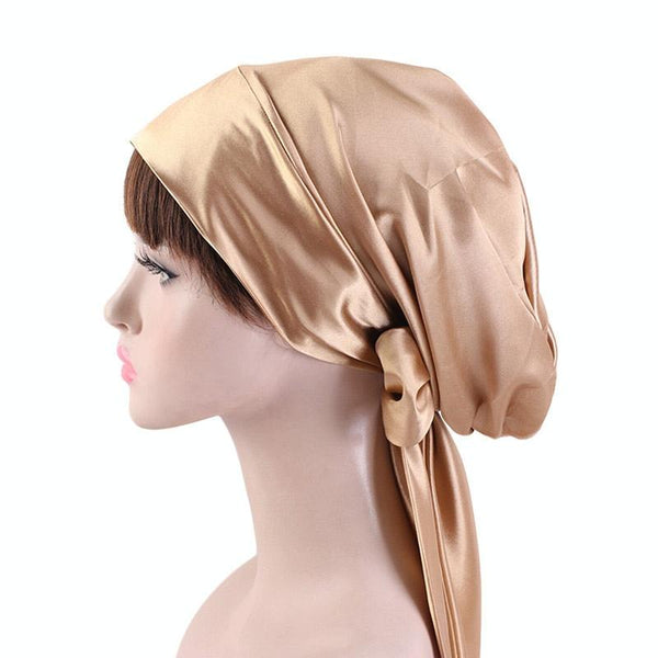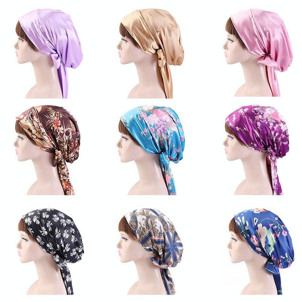 TJM-226 Ladies Satin Print Ribbon Bow Turban Hat Night Cap Silk Chemotherapy Hat Long Tail Braid Hat(Khaki)