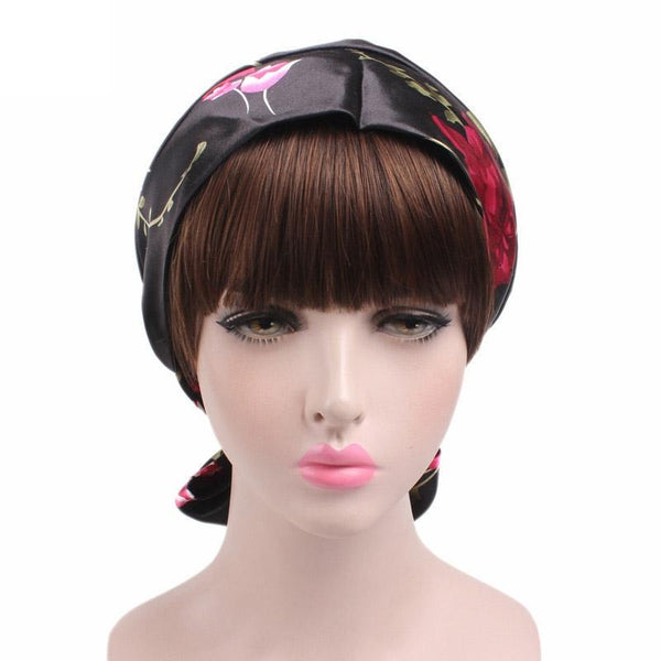 TJM-226 Ladies Satin Print Ribbon Bow Turban Hat Night Cap Silk Chemotherapy Hat Long Tail Braid Hat(Lake Blue)